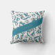 This cool volleyball team colours throw pillow for girls features a pattern of varied size stylized teal, grey and white volleyballs turned every which way overlying a volleyball net detail graphic - the volleyballs' teal & grey panels are blended with an artsy, girly floral pattern - personalize her name in a sophisticated handwritten font on a bold, angled, full width teal colour strip - background and name strip colours are customizable - by katz_d_zynes