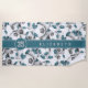 This soccer themed beach towel for girls or boys features a random, 3D-look pattern of varied size soccer balls turned every which way on a customizable white background - the typically black panels on each soccer ball have been recolored teal & grey - personalize with the athlete's name and jersey number - by katz_d_zynes