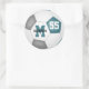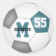 These sporty soccer 3 inch round stickers for a girl or boy feature a simple soccer ball graphic with teal, grey and white panels - customize with the athlete's name, monogram and jersey number - by katz_d_zynes