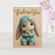 This beautifully gentle “Thinking of You” card features a cozy baby bunny in a teal knit bonnet and romper, holding a tiny bouquet of soft white blossoms. With warm tones and a tender expression, this card is perfect for offering comfort, sending love, or reminding someone they’re cherished and remembered. Soft, heartfelt, and irresistibly sweet.