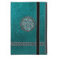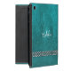 Personalized Teal Leather Celtic Knot Tribal iPad Mini Case. A faux leather folio cover in a rich teal blue green with a silver, stone and mint green Celtic shield knot, and silver Celtic chains. Fill in your name and initial at the prompt to personalize and customize anyway you like.