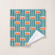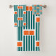 This towel set has a mid-century modern design made of five teal lines and two orange rectangles repeated across the design.
