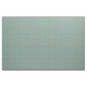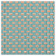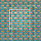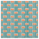 This fabric has a mid-century modern design made of five teal lines and two orange rectangles repeated across the design.
