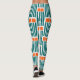 These leggings have a mid-century modern design made of five teal lines and two orange rectangles repeated across the design.