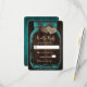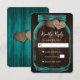 Rustic teal wedding RSVP card featuring a mason jar with two burlap hearts against a barn wood background.