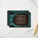You can slip this card into your wedding invitations to let out of town guests know of any hotel arrangements or group codes. Rustic teal wedding enclosure card featuring a mason jar against a rustic wood background. Two burlap hearts at the back.