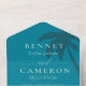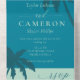 All in one wedding invitation in deep cyan and mint green with elegant fonts and the silhouettes of palm trees. Perfect all in one wedding invitation for beach weddings, destination weddings.