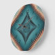 A symmetrical geometric pattern design in a square format with a teal and copper colour scheme. The centre features a large diamond-shaped medallion with intricate line work and a circular sunburst pattern inside. The medallion is surrounded by four smaller diamond-shaped frames with ornate border patterns. The background has a radiating sunburst effect emanating from the centre, creating a dynamic sense of movement. The outer border consists of jagged, sawtooth-like spikes in copper tones against the teal background. The entire design is enclosed by a thin dotted line border. The colour palette transitions from deep teal in the centre to lighter turquoise tones near the edges, with copper accents in the spikes and decorative elements. The pattern has a Native American or Southwestern design influence with its geometric shapes and radiating motifs.