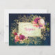 This Victorian floral bouquet wedding RSVP enclosure card has old-world style and charm in a bold watercolor background colour scheme of midnight navy blue, teal blue, and Hunter green. Sitting on top of the rich colours are layers of taupe gold foliage and greenery with floral line art illustrations of flowers and plants with a rectangular frame with gold edging and a beautiful, ornate gold scroll frame that has the word "Response" in fuchsia pink in the centre. On the upper right and lower left corners are large bouquets of roses, peonies, leaves, ferns, and other assorted flowers in deep pink, coral, cream, ivory, white, peach, blue, purple, wine, and green. The back of this vintage floral wedding response enclosure card insert uses the same colouring, flowers, and foliage that is on the matching wedding invitation, only the flowers are on the left side so that all your RSVP details can fill the remaining area, which includes entree selections if needed, or you can use this A2 sized card as a reception and/or an accommodations or directions card instead with all details in fuchsia pink and teal blue. If you need any additional matching items, please email your request to niteowlstudio@gmail.com or use the Zazzle chat feature to get in touch.