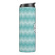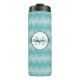 This attractive thermal tumbler has a background of light and dark ombre teal chevron stripes. At the center front is a white circle name banner lined in black, with an inside frame of teal dots. Your monogram is in light teal at the center, and your name is written across the monogram. Classy and pretty!