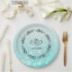Personalized bride and groom initials and wedding date pretty teal paper plates with fancy decorative black border.