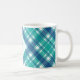 This mug features a trendy teal and dark blue diagonal plaid pattern. A white diamond shape, in the centre, offers a custom monogram.