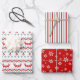 This set of coordinated Holiday gift wrap sheets features patterns in tones of bright red, teal blue, and white. One paper has red reindeer, chevrons and tree bulbs paired with teal blue snowflakes. Another paper has alternating teal, white, and red stripes. And the third paper is matching red with white ornate snowflakes. A colourful, bright and festive combination. *Thanks to AMB Illustrations for the patterns used in this set.