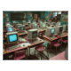 Welcome to the tech temple of the past—where teal walls, CRT monitors, and maroon chairs conjure the golden age of floppy disks and dial-up dreams. This vividly nostalgic classroom pulses with analog charm and 90s digital magic. A perfect tribute to vintage computing in full neon-academic glory.