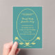 Add a unique touch to your wedding invites with a teal and gold acrylic wedding invitation. The front features a rose design along with the details of the wedding. Just change the text to fit your needs. Use the template to personalize.