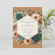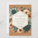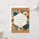 Evoke a sense of warmth and romance with this elegant autumnal design. A rich palette of deep teal and warm russet-orange creates a striking contrast for your special day. Lush, painterly bouquets of teal and creamy-beige blossoms are artfully arranged with delicate foliage. This artistic botanical arrangement is perfect for a sophisticated fall union.