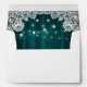 Rustic teal wedding envelopes featuring white floral lace and string lights on a barn wood background. Easily personalize with a return address.