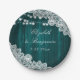 Elegant and romantic rustic teal wedding party paper plates inspired by barn wood, white floral lace and string lights.