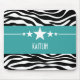 Trendy and modern Sassy Star Zebra Mousepad featuring a chic black and white zebra print background and a bold turquoise border adorned with a fun star motif. This girly design may be customized with the personalized text of your choosing. Click "Customize It" to find more personalization options.