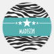 Trendy and modern Sassy Star Zebra Stickers featuring a chic black and white zebra print background and a bold turquoise border adorned with a fun star motif. This girly design may be customized with the personalized text of your choosing. Click "Customize It" to find more personalization options.