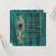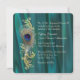 Chic teal satin looking square wedding invitation, with lovely graphics of a gold tone flourish up the left side with a colourful eye of a peacock feather and three little pearls. Text in off white is ready to personalize for your wedding day. Matching products available.