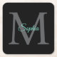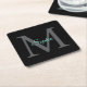 Teal Script Name, Large Grey Monogram on Black Square Paper Coaster