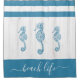 “Beach life”. Whenever you shower with this seaside shower curtain, you can be rest assured the summer seashore fun will continue. Three graphic, dusty teal blue vintage seahorses overlay beachy white rustic, weathered, coastal wood. Great for the family beach house, your nautical lifestyle, or just to bring a bit of the beach into your home all year round!