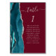 The left-hand edge of this elegant modern wedding table number card features a teal blue watercolor agate border trimmed with faux silver glitter. The word "table" appears in silver grey handwriting script on a burgundy background. Add the names of your guests who are assigned to each table.