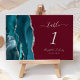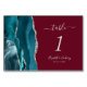 The left-hand edge of this elegant modern wedding table number card features a teal blue watercolor agate border trimmed with faux silver glitter. The customizable text combines silver grey handwriting, italic and copperplate fonts on a burgundy background.