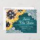 Personalized rustic teal and sunflower wedding save the date postcards ideal for your teal rustic country, backyard, or barn wedding party inspired by sunflower flowers.