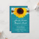 Teal Sunflower Rustic Country Wedding Invitation Template. This unique wedding announcement features distressed teal aqua blue background on both sides of the invitation. The invitation has a printed lace embellishment and twine embellishment. On top of that is a bright yellow sunflower, front and centre at the top of the invite. The lace and twine are just printed designs. It is not actual lace or twine.
