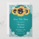 Teal rustic floral wedding save the date cards featuring sunflowers on a teal background adorned with white floral lace and string lights. Matching items available.