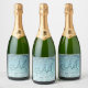 Wedding reception favours. Classy turquoise teal green floral monogram pattern custom sparkling wine bottle labels. Chic, elegant, modern, trendy, stylish, beautiful succulent metallic. To customize script, click on edit design. Image copyright Marg Seregelyi Photography.
