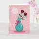 This card shows a stylized bouquet arranged in a sleek teal vase that sits in the lower half of the design, catching a soft highlight like a gentle glance shared between friends ❤️. A bright fuchsia ribbon wraps the vase neck and forms a neat bow, adding a gift-like touch that feels affectionate without being overdone. Two large deep burgundy blossoms rise above, their rounded petals leaning slightly toward each other as if in a quiet, caring moment. Dark green leaves and thin sprigs with tiny white flowers fill out the arrangement, giving the bouquet a light, airy contrast. The background is pastel pink with softly faded white circles scattered around, creating a calm, dreamy setting. In the upper left, a white circle holds the words “Happy Mother’s Day” in dark lettering that stands out clearly, with the text centered inside the badge 🌼. A deeper pink shadow sits just beneath the vase, grounding it against the pink backdrop while the diffused white circles float behind the flowers.