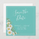 Pretty Save the Date announcement features watercolor white daisies corner on light teal background with white customizable text blocks in modern fonts. Add custom QR code and other info on back.