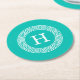 Teal Wht Greek Key Rnd Frame Initial Monogram Round Paper Coaster