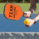 Team Awesome Funny Sports Simple Typography Name Pickleball Paddle features the text "Team Awesome" with your personalized name below on an orange background. Personalize by editing the text in the text boxes provided. Perfect gifts for Christmas, birthday, Mother's Day, Father's Day and more. Designed by ©Evco Studio www.zazzle.com/store/evcostudio