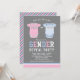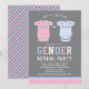 Pick a team with this charming gender reveal party invitation featuring light pink and light blue baby outfits on a soft grey background. Playful "Gender Reveal Party" lettering in a sporty team-inspired style is framed by coordinating pastel stripe and polka dot accents. The grey backdrop pairs beautifully with the gentle pastel tones for a modern, polished look. All text is fully customizable.