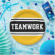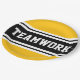 This sporty, athletic design features bold TEAMWORK text inside a highlighted wide black stripe with double white racing stripes against bright yellow outer stripes. The text in this design can be personalized.