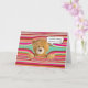 Cute brown teddy bear in colourful warped stripes with speech bubble for 50th birthday.