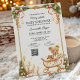 This winter baby shower invitation brings a sweet and cozy holiday charm to your celebration with its soft tones, gold accents, and the most adorable teddy bear nestled in a festive sleigh. Evergreen branches, pink bows, twinkling ornaments, and glowing candles frame your details in a warm and welcoming way that feels perfect for a Christmas season gathering. The gentle palette and storybook style create a joyful atmosphere for honoring the mother to be, and you can easily personalize every detail to make the event feel even more special.
