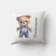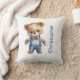 An adorably cute teddy bear dressed in a blue outfit on this throw pillow for babies nursery. Personalize it with babies name or any text.