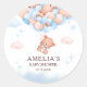 A sweet baby shower sticker featuring an adorable teddy bear hanging from a soft cluster of blue and blush balloons with dreamy clouds and star accents. The gentle watercolor style makes it perfect for sealing favors, decorating envelopes, adding to party gifts, or coordinating with matching baby shower stationery. A lovely choice for a boy baby shower, teddy bear celebration, or soft pastel party theme.