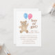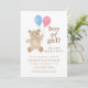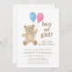 This charming gender reveal invitation is decorated with a watercolor teddy bear and blue and pink balloons. It says "We can bearly wait" in simple typography and is easily customizable.