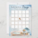 It's a Boy and We Can Bearly Wait Baby Shower "Bingo" script text game design featuring a cute little bear dressed in a blue raincoat witha blue umbrella. He is sitting beside a water puddle playing with his wooden blocks among the reeds, grasses and mushrooms. Composite design by Holiday Hearts Designs.