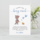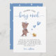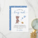 Cute teddy bear theme boy's birthday party thank you card featuring watercolor illustration of a cub in a sailor outfit with a duck toy and blue heart. The message thanks guests for attending the party. The text at the top says "thank you BEARY much!"