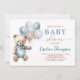 Trendy blue boy baby shower invitation featuring cute teddy bear with blue and brown pastel balloons and pastel blue colour on the background of the invitation. Matching items available.