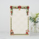 Lush Garland and swagged Drapes with two cute Christmas Teddy bears dressed in their holiday finery. Little boy bear is wrapping a gift and little girl bear is holding a gingerbread cookie. Lightly textured background.