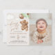 Invite friends and family in style and set the tone for your special day with this charming birthday invitation. Design features teddy bear with green balloons on beige background.