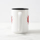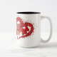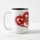 A white ceramic mug featuring a design of a heart shape composed of smaller red hearts, with a cute brown teddy bear holding a small red heart inside the main heart. The mug has a black rim and handle